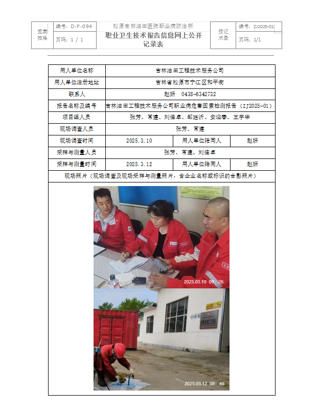 吉林油田工程技术服务公司职业病危害因素检测报告(ZJ2025-01)