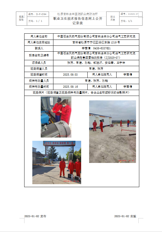 中国石油天然气股份有限公司吉林油田分公司油气工艺研究院职业病危害因素检测报告(ZJ2025-37)