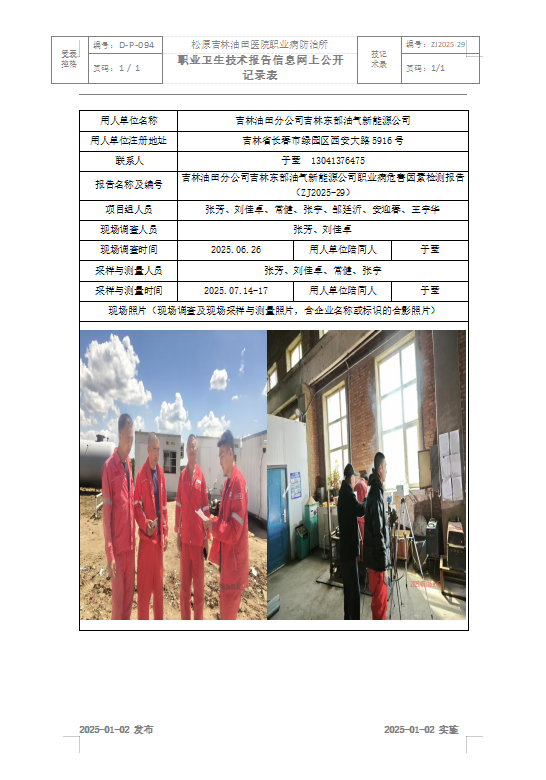 吉林油田分公司吉林东部油气新能源公司职业病危害因素检测报告(ZJ2025-29)