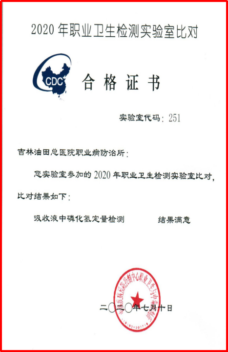 职防所作为吉林油田公司的职业卫生技术服务机构,按照相关法律法规要求,于1992年经吉林省质量技术监督局计量认证合格,并于1998年、2003年、2008年、2011年、2014年、2017年通过实验室资质认证复审。按照2002年颁布的《职业病防治法》的要求,2004年经吉林省卫生厅批准获得了职业健康监护和职业卫生检测检验服务评价资质,并于2008年、2012年、2015年、2018年通过续展评审。目前除省职防院以外,全省只有两家机构能够承担重金属体检工作,职防所是其中一家,连续多年参加国家相关部门举办的实验室对比试验,均获得满意或优秀结果。多年来开展科研3项,在国家级刊物上发表论文50余篇,参与起草、修订、评审中国石油及吉林省职业卫生管理制度、考核标准、技术标准等20余个,多次受到中国石油及省市主管部门的好评。