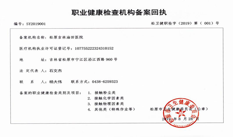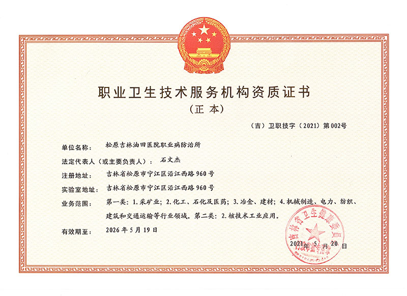 松原吉林油田医院职业病防治所(以下简称职防所)成立于2003年,是在原吉林油田卫生防疫站(1981年建站)的基础上建立起来的,隶属于松原吉林油田医院。职防所目前已经发展成为全省资质较全面的职业卫生技术服务机构之一,持有职业卫生检测与评价(包括工业放射卫生)乙级资质、建设项目职业病危害评价(包括工业放射卫生)乙级资质、职业健康检查资质、职业病诊断资质。