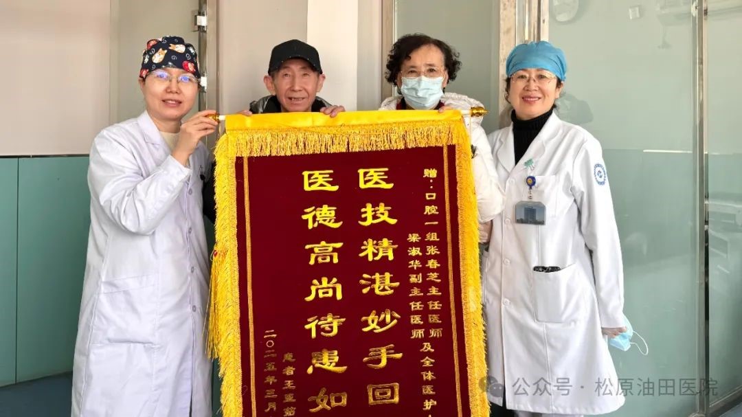 日前,一位78岁的老爷爷用一双颤微微的手把一面绣着"医技精湛妙手回春,医德高尚待患如亲"的锦旗,送到了松原吉林油田医院口腔一组张春芝主任的手里。那金线游走的十六个字,诉说着杨爷爷与老伴儿与口腔病魔抗争的惊心历程,更见证着医患之间跨越血缘的温情守候。