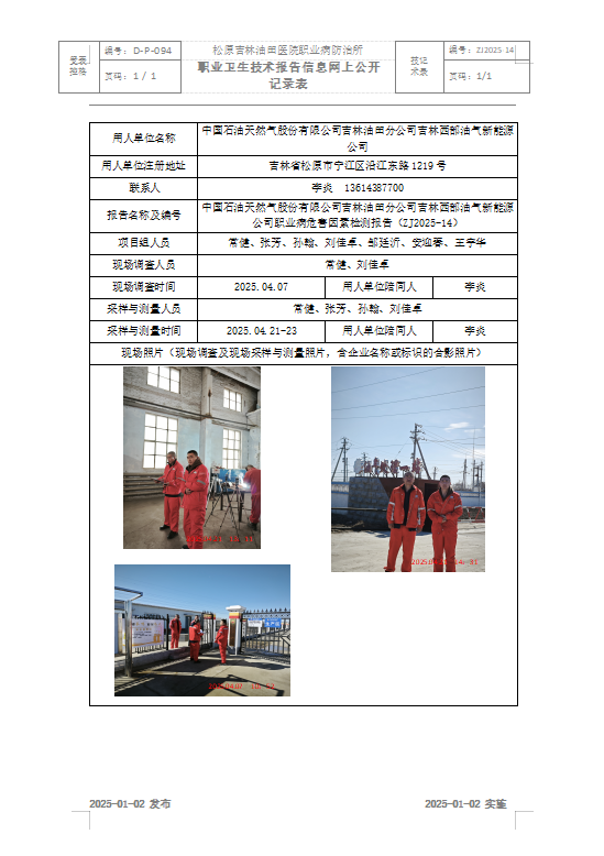 中国石油天然气股份有限公司吉林油田分公司吉林西部油气新能源公司职业病危害因素检测报告(ZJ2025-14)