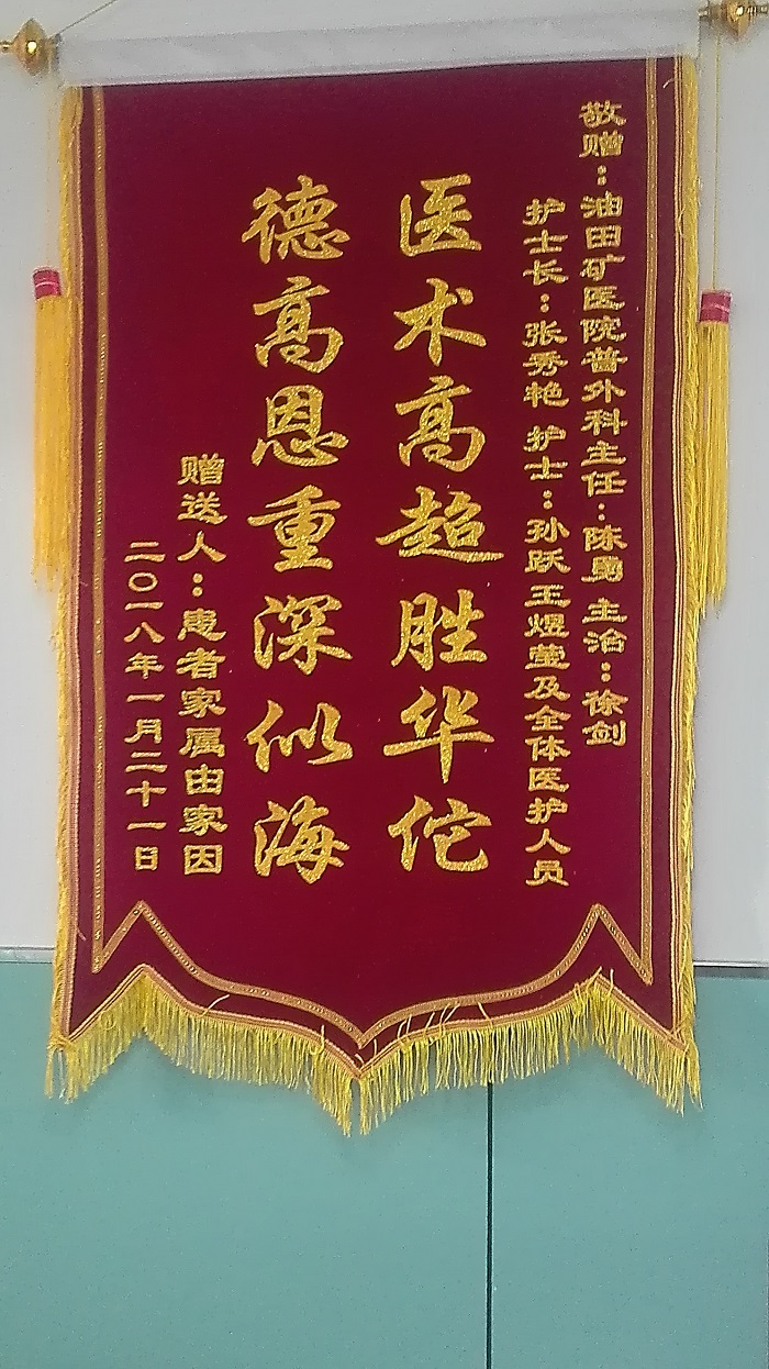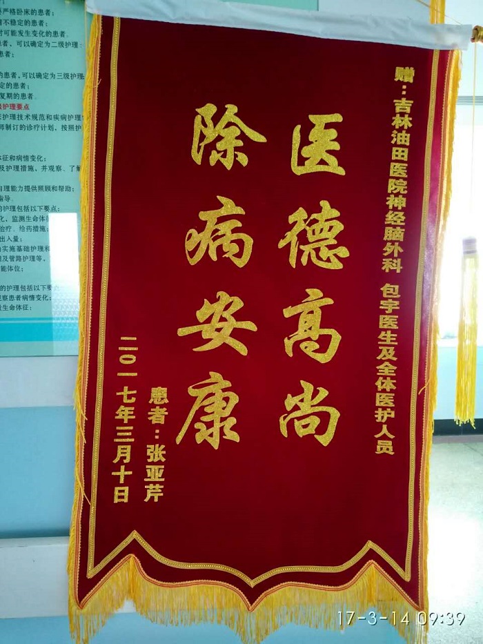 在当今建设小康社会中,我们患者在享受良好的医疗中,最需要的就是尽快把病治好,减轻病痛。现代医学的发展迅速,过去无法医治的病,现在也可以治愈了。这次住院,让我近距离地看到油田总医院神经外科的高超医术,在治疗过程中让我多了安全感,住院患者都有和我一样的感受,归根结底就是你们的高超医术,给患者带来福音。希望油田总医院神经外科再接再厉,勇攀医学高峰。