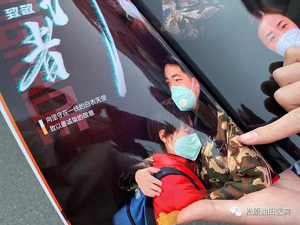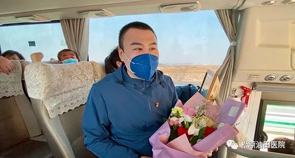 松原吉林油田医院院长石文杰、副院长吴优、韩伟、院长助理白玉雪及相关科室主任乘专车与11位援鄂队员家属一同前往查干湖机场迎接,迎接离家47天的援鄂英雄们回家。