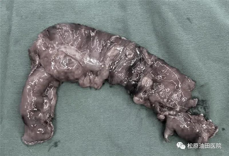 因为多发憩室感染,回盲部及升结肠与腹膜后粘连非常严重,所以游离右半结肠相当困难,但在陈勇团队与麻醉科及手术室密切配合下,经过近2个小时的艰苦努力,终于完成了此例完全腹腔镜下右半结肠切除术(腔内吻合),这也是继普外二科开展腹腔镜下部分肝切除、胃癌根治术、直肠癌根治术、胆管切开取石术等之后,医院腹腔镜已实现全覆盖,标志着松原吉林油田医院腹腔镜技术的驾驭能力又迈上了一个新的台阶。