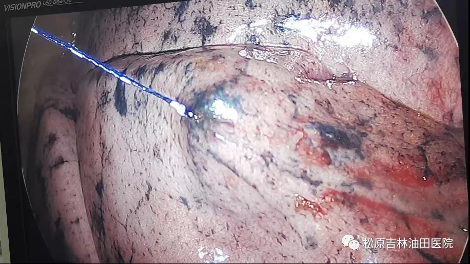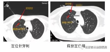 术中采用专用的肺结节定位针,它由一根穿刺针和针管内的一根定位线、定位锚组成,定位锚为四个倒刺结构,倒刺前端圆钝,在保证牢牢钩住肺组织的同时又减少肺组织损伤,医生在胸腔镜下能明确看到病灶部位,从而将结节摘除。