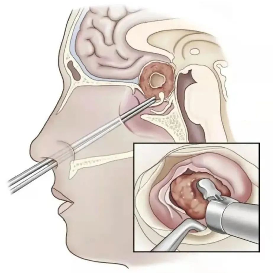 目前最常用的手术入路就是--单鼻孔经蝶窦入路,简单的理解,就是从一个鼻孔进去把肿瘤切除。
