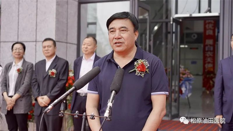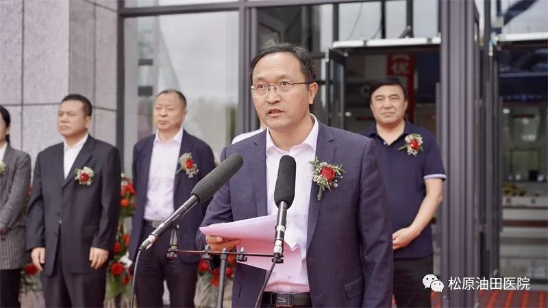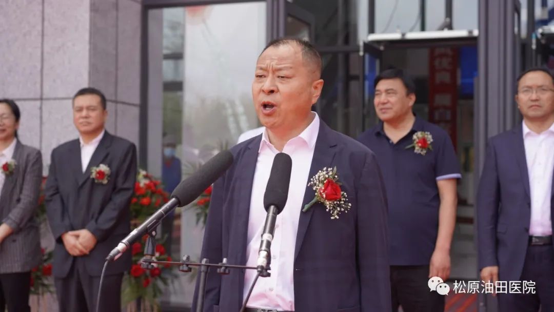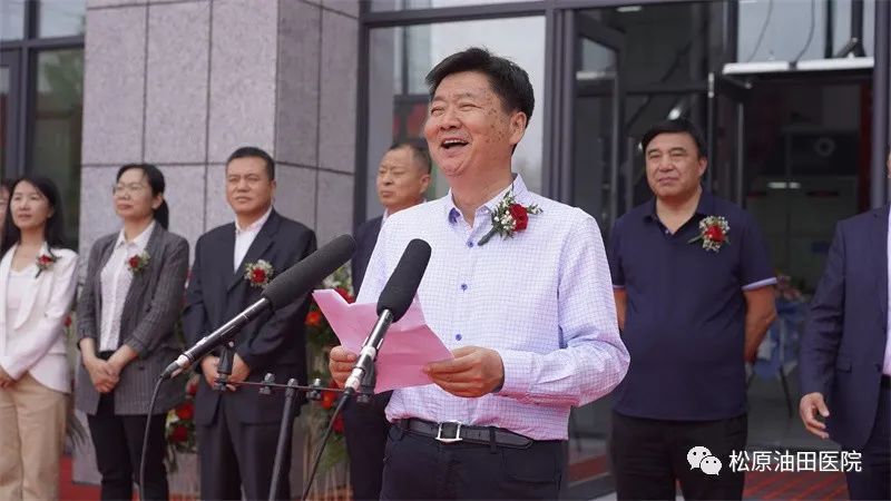 韩伟同志为开业庆典致辞。他首先对参加今天庆典仪式的各位领导、嘉宾表示热烈的欢迎!对数十年来在江北医院发展建设中,一直给与大力支持的政府部门、社会各界以及吉林油田公司表示衷心的感谢!他说,2019年,为进一步谋求医院发展,在时任院长石文杰的领导下,对江北医院的发展进行了重新谋划,确定了“大专科小综合”的发展定位,并将江北医院门诊综合楼建设纳入医院十四五发展规划。经过近一年多的筹备和建设,蓝图变成现实。新门诊综合楼的启用是江北医院硬件设施的新升级、是服务职能的新拓展,更是医院腾飞发展的新引擎。他要求江北医院大楼之上要立大志。奋力推进医院发展建设,以硬件设施的改善,丰富精神内涵,带动思想、管理、机制和文化的更新优化,使江北医院面貌一新、发展提速、人心更齐、人气更高。二是大楼之上要谋大局。全力扛起服务油田职工家属、服务全市百姓健康的大旗,打造以康复理疗、血液透析、体检服务、消化内镜、综合内科为品牌的“大专科小综合”精品医院。三是大楼之上要成大业。不忘医者初心,牢记为人民谋健康的使命,继续秉承优良传统,勇担社会责任,用一流的技术、一流的服务、一流的环境、一流的管理来回报社会,为促进全市卫生健康事业发展做出新的更大的贡献。