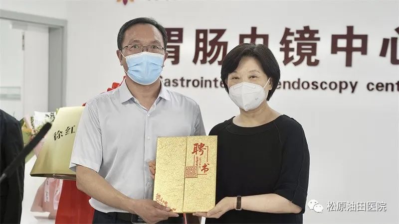 松原吉林油田医院院长、党委书记、宁江吉林油田江北医院院长韩伟为吉林大学第一临床医院胃肠内科·内镜中心徐红教授发特聘专家的聘书。