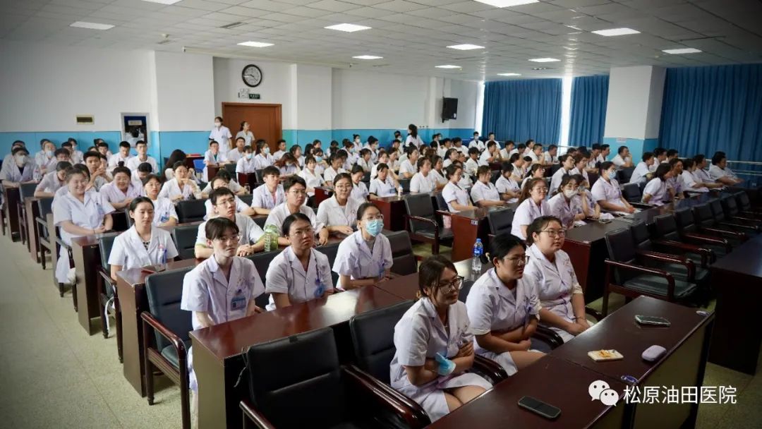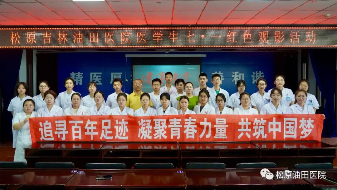6月26日,松原吉林油田医院始终不忘临床医学院教育职责,在七·一党的生日来临之际,教务科组织141名吉林医药学院临床本科专业医学生在14楼多功能会议室观看爱国主义教育影片 《建党伟业》。