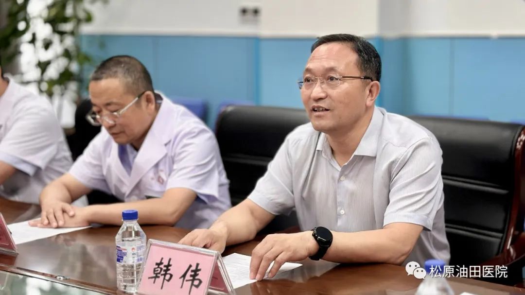 在交流会上,医院党委书记、院长韩伟说:“吉大一院的各位专家在百忙当中冒雨来到松原吉林油田,参与‘庆七一,服务百姓健康’大型义诊活动,与我们医院的各位专家共践服务百姓,共庆建党一百零二周年华诞,对你们的到来表示热烈欢迎和衷心感谢!近年来,吉大一院作为国家区域中心,是吉林省医疗龙头单位,领跑着吉林省医疗事业健康快速发展。同时,你们不辱使命,充分发挥医联体这种传帮带的作用,视我们松原吉林油田医院为兄弟,方方面面关爱给予大力支持和关爱,我们感到非常荣幸和自豪。我们医院也借助深化改革,回归央企的契机,步入了持续快速发展的阶段。不论是技术引进、人才引进、设备更新,特别是学科建设都呈现出良好的发展势头,这与吉大一院多年来的支持和帮助是分不开的,希望吉大一院今后一如既往地在学术、学科管理、医德医风建设方面能够深入合作。”