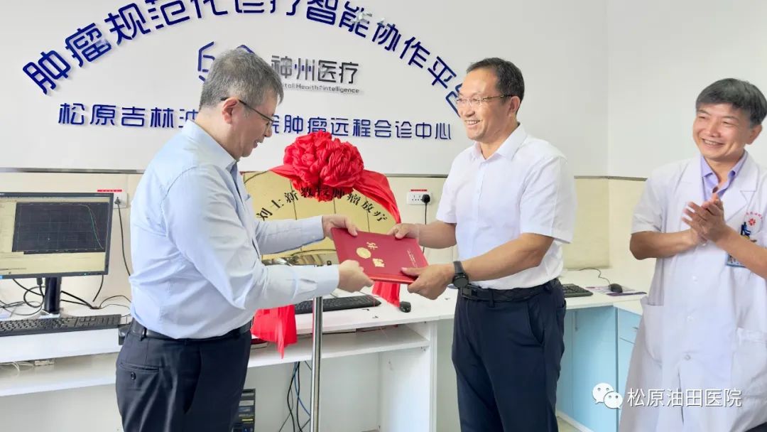 松原吉林油田医院医院党委书记、院长韩伟讲了话。他说,是一份乡情,更是一份医者的责任,让刘士新教授回家乡助力我们肿瘤治疗事业,这是油田医院的荣幸,也是家乡百姓的一份期许,我们表示热烈欢迎。他说,我们医院肿瘤科目前是全市规模较大的科室,不论是设备、人才、技术项目、基础设施,在地方都处于领先地位,患者信任度也比较高,科室也处于较大的工作量的状态。但近几年来,随着科技不断发展、医疗政策的调整,以及患者对肿瘤治疗的就医体验不断地提高,我们现在急需加强科室业务能力的提升和管理,进一步提升地区影响力。刘士新教授是吉林省肿瘤医院恶性肿瘤精准放疗研究中心主任,首席专家,也是中华医学会放射肿瘤治疗学分会副主任委员,学术造诣深厚。今天“刘士新教授肿瘤放射工作室”正式揭牌,我们能与刘士新教授团队正式签约,恰逢其时,我们感到非常荣幸,相信,在通用技术宝石花医疗合作公司——神州医疗的远程会诊智能协作平台的加持下,我们的肿瘤放疗、化疗,包括生物治疗、靶向治疗等诊疗能力会得到跨越式提升。